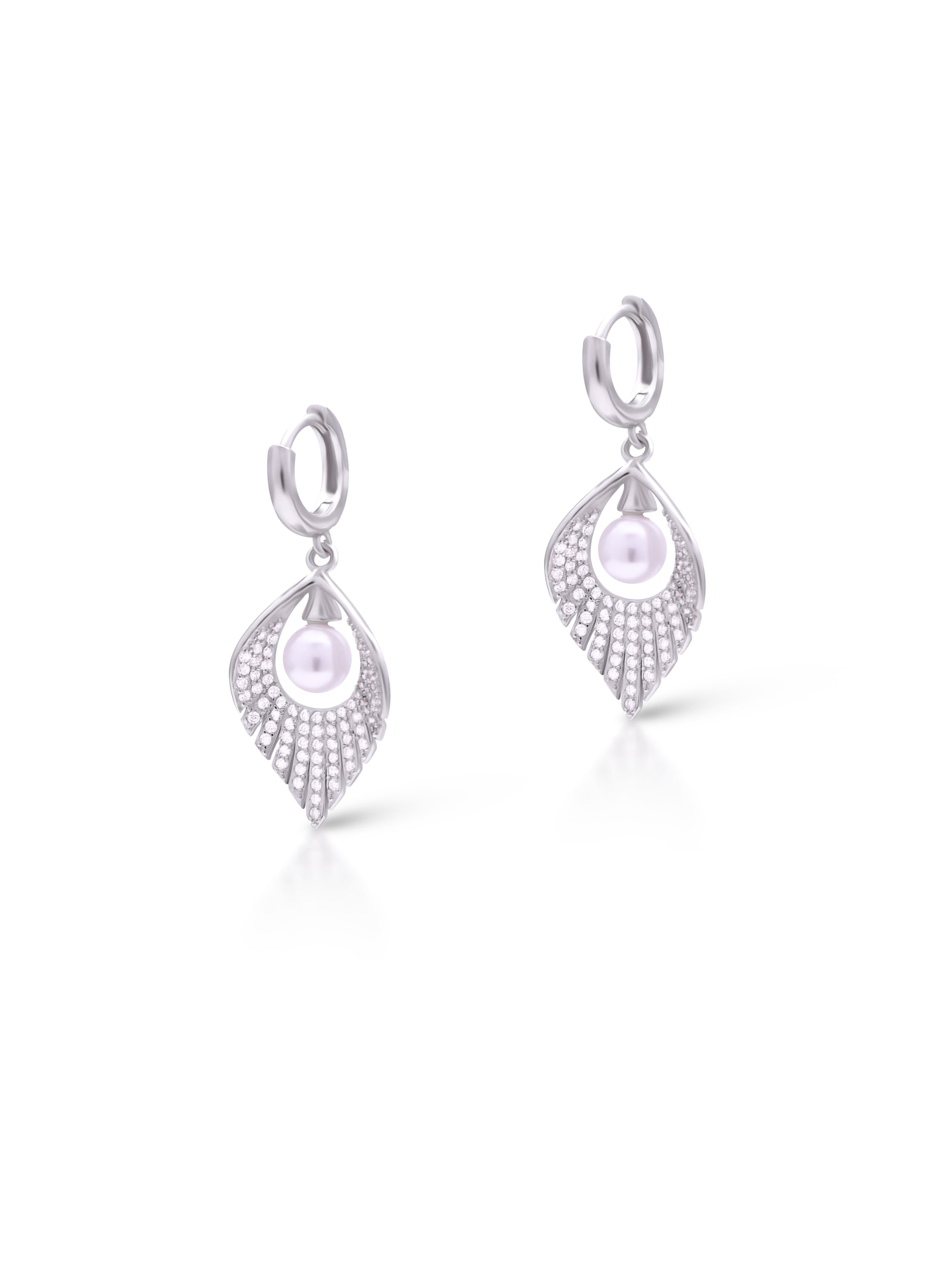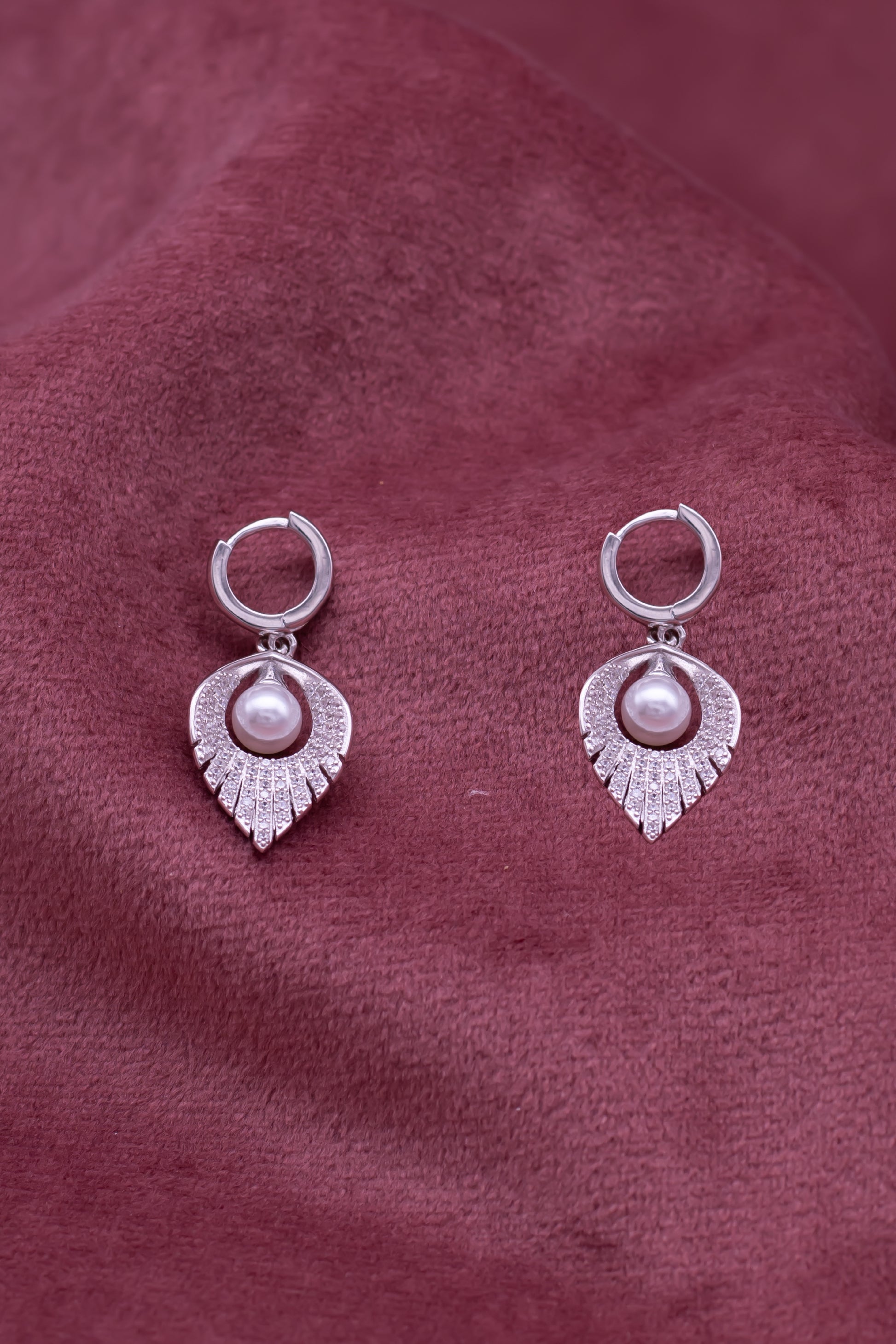 The earrings feature a smooth silver-plated hoop with a beautiful pearl placed inside a detailed fan-style design. The fine stone detailing adds a gentle sparkle without looking too heavy.