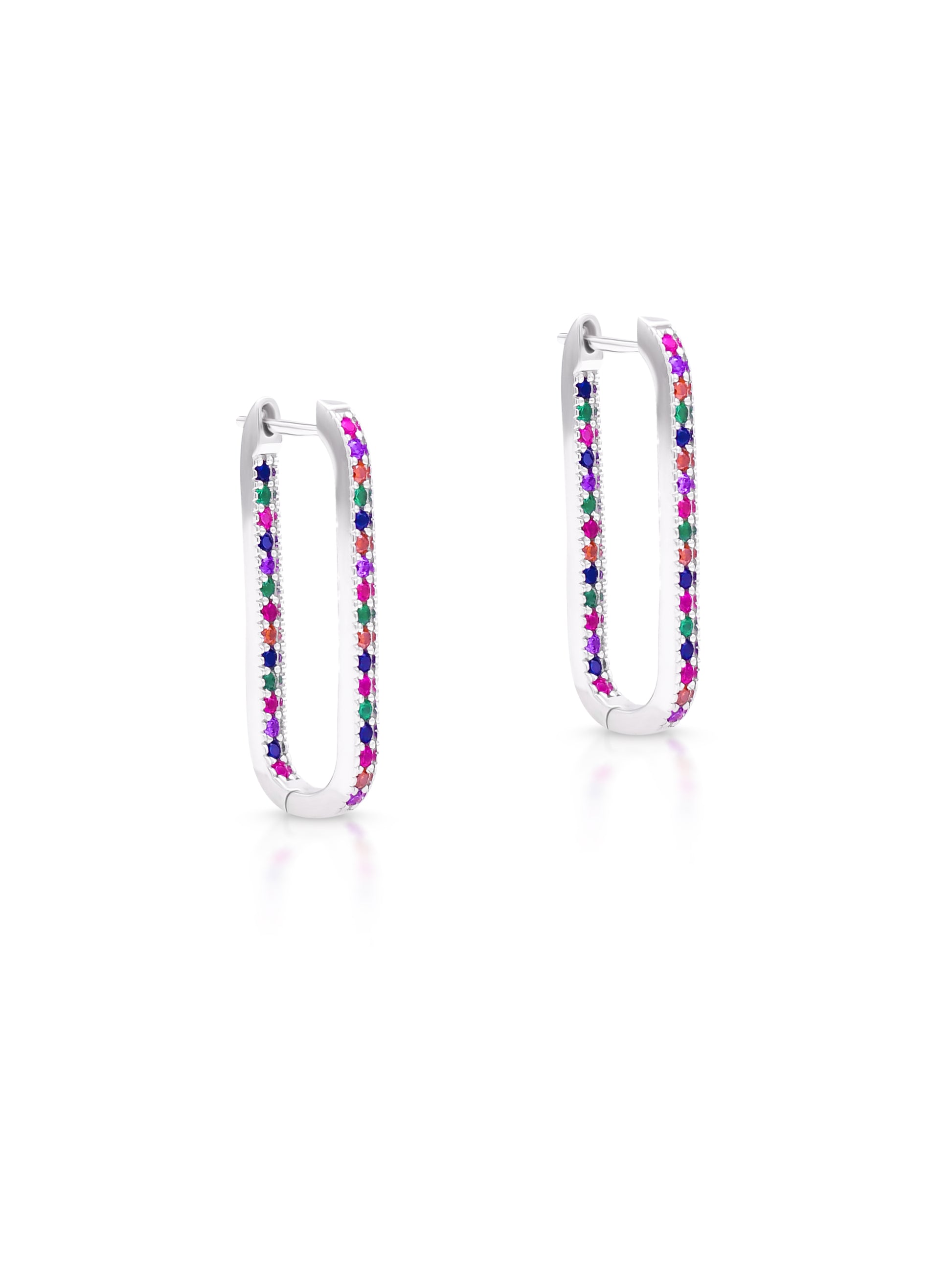 Add a touch of color and elegance to your everyday look with these Multi-Color Stone Rectangle Hoop Earrings. Designed in a modern rectangular shape, these lightweight hoops are crafted with premium silver plating and lined with vibrant multi-colored stones for a stylish finish.